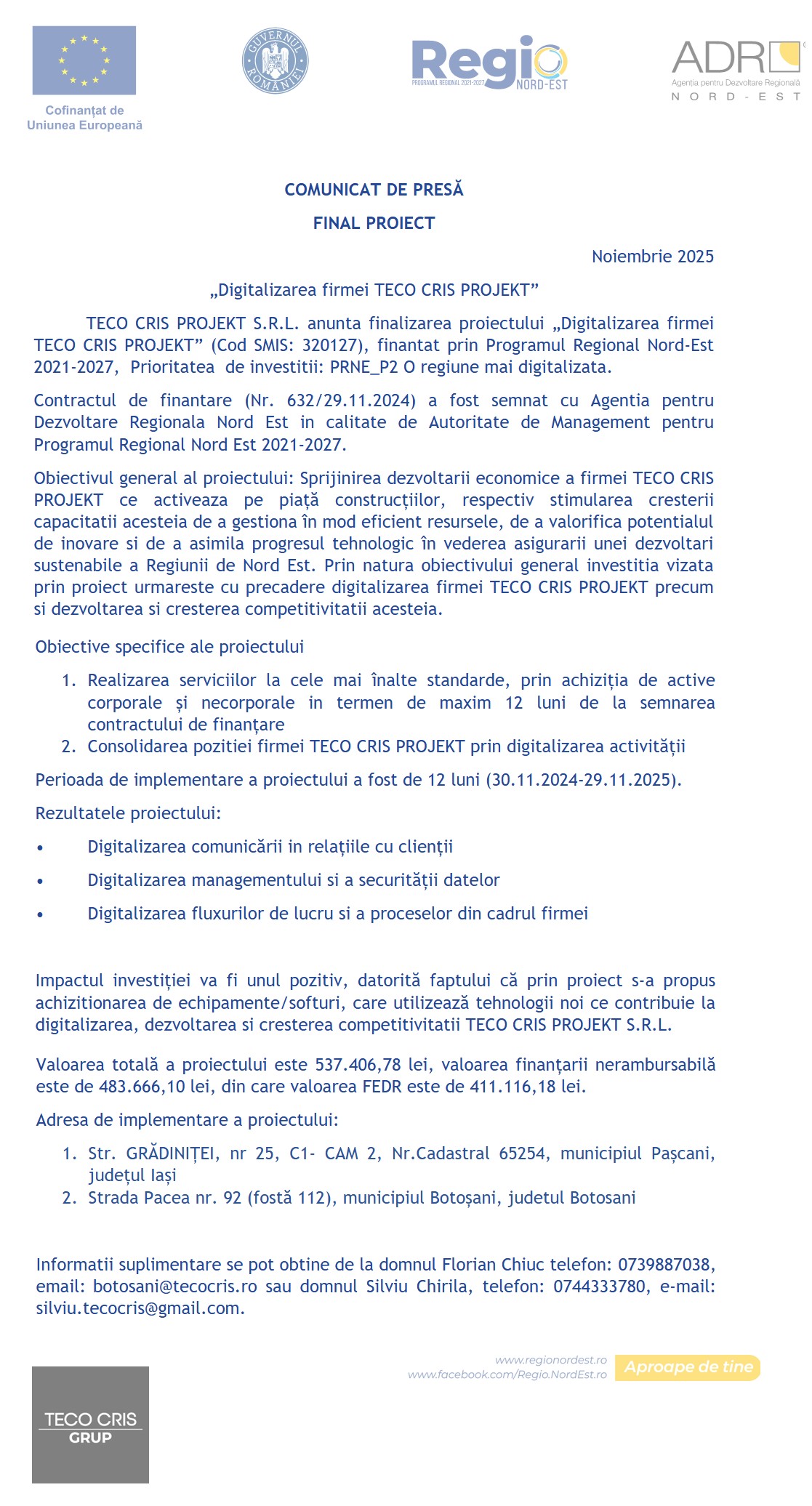 Adresele de implementare sunt în municipiile Pașcani și Botoșani, iar reprezentanții companiei oferă informații suplimentare la contactele oficiale. „Sprijinim digitalizarea pentru a asigura o dezvoltare sustenabilă și pentru a valorifica potențialul de inovare”, a declarat echipa TECO CRIS PROJEKT.