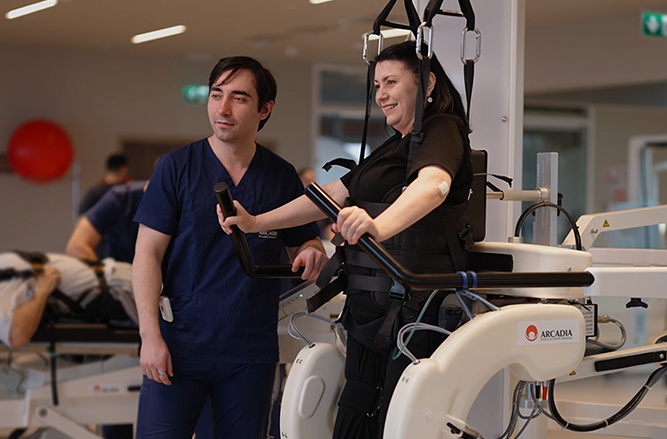 Astfel, terapia combină ședințe de kinetoterapie cu tehnologii robotizate precum Erigo, un sistem care asigură verticalizarea pacientului până la 90 de grade, și Lokomat, care asistă reeducarea mersului prin sprijin controlat al picioarelor.